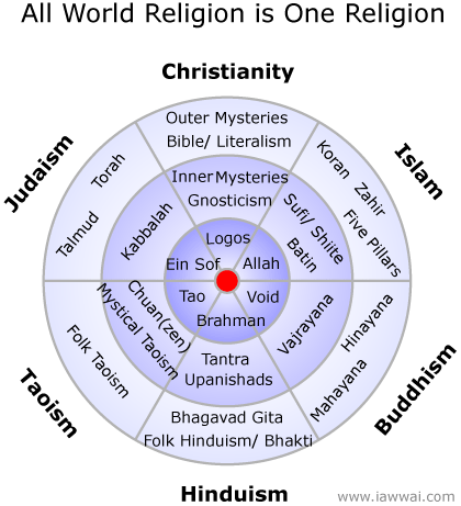 Aceasta diagrama, in afara de faptul ca arata unitatea esentiala a tuturor religiilor lumii, ilustreaza si faptul ca toate religiile au o parte exoterica sau vizibila, dar au, de asemenea, si un aspect ezoteric sau ascuns. In sectiunile exterioare ale diagramei, sunt reprezentate fatetele exoterice ale religiozitatii mondiale.