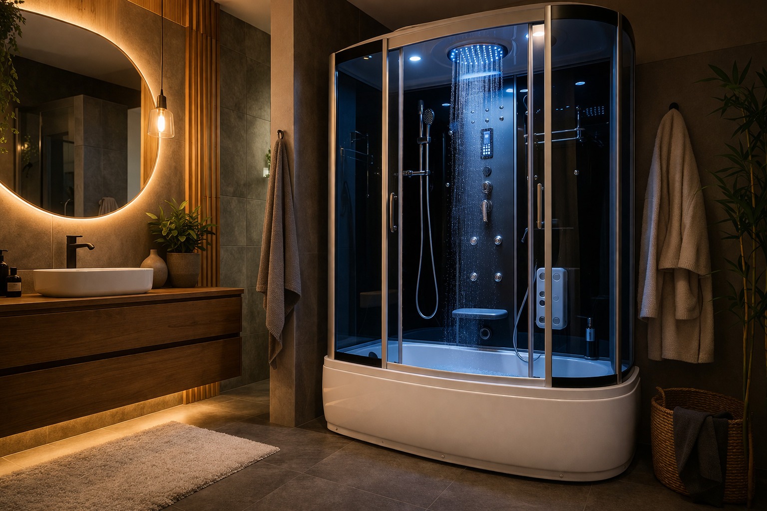 Cumperi, de fapt, un sistem mai complex decât un duș obișnuit. Nu mai ai doar o baterie, o para și o scurgere corect montată. Ai panou de comandă, duze, furtunuri interne, uneori funcții de abur, uneori radio, iluminare, ventilare, poate chiar plafon cu ploaie tropicală.